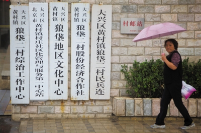 9月25日,大兴狼垡二村,村委会门口挂着股份合作社的牌子。新京报记者 周岗峰 摄
