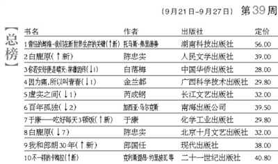9月最后一周的总榜,虽有三本新书上榜,但新书的整体实力仍不能打破老牌畅销书称霸榜单的局面。这样的榜单就像已到尾声的《中国好声音》:少了万箭齐发的热闹场面,只剩下几位实力唱将轮番上台,谁胜谁负大致也能猜到个八九不离十,观赏的乐趣自然大打折扣。
