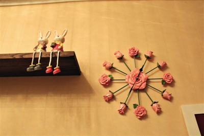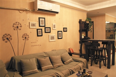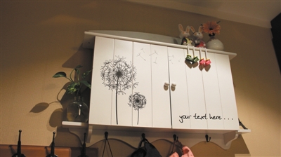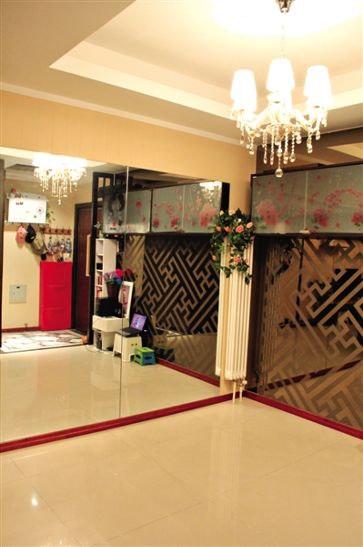 右侧一角,用小卧室做柜子剩的板子,让木工做了个CD架,放成堆的音乐和舞蹈光盘。网上买的小床头柜也放这里,放我的音响,成为平时跳舞、放音乐的小区域。由于做教练,平时在家经常要练舞,所以我没买餐桌餐椅占地方,而是把原来餐厅的地方设计成一个练习的小舞蹈房,旁边的柜子玻璃门上贴着花花绿绿的墙贴,家人说像幼儿园。