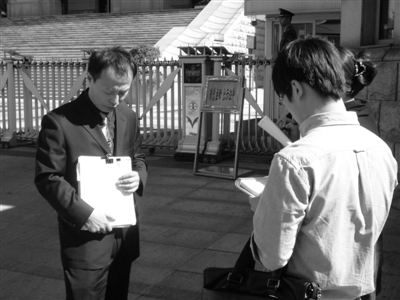 昨日上午9时,原告律师郝俊波出现在二中院的门外。