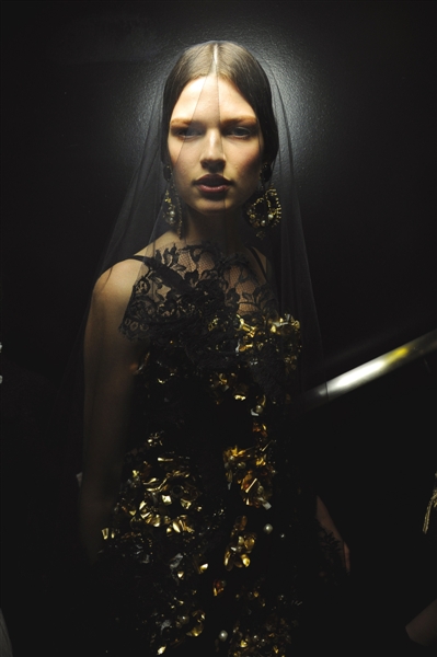 Dolce&Gabbana 2012秋冬女装秀的后台,一场充满神秘的电影时装梦正悄悄上演。这些华丽夸张的服饰灵感来自于意大利西西里岛的巴洛克建筑。Domenico Dolce和Stefano Gabbana也向《新京报》独家提供了由摄影师Julian Broad拍摄的二人合影。