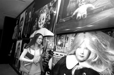 昨日,今日美术馆内,艺术家曲家瑞带观众看她的芭比娃娃系列作品,手里还拿着一个二手娃娃。 新京报记者 孙纯霞 摄