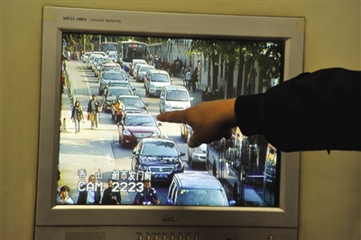 香山派出所的民警在监控室辨认违规运营车辆。