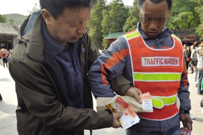 便衣民警从一名假交通协管员(右)身上搜出了香山公园的赠票。昨日,多部门对香山周边“黑停车”、“黑导游”等进行整治。本版摄影/实习生 黄怡