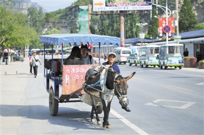 九渡村街头拉载游客的驴车。