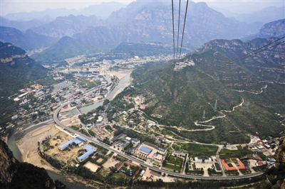 从拒马河东岸的天禄山山顶俯瞰十渡旅游核心区全景,被拒马河分割开来的三片居住区,由近及远,依次为八渡村、九渡村及十渡镇政府所在的十渡村。