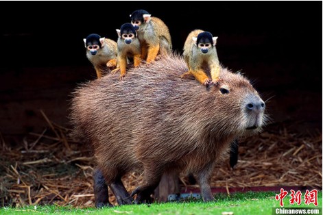 女摄影师克里是在荷兰一家野生动物园中拍到这些有趣场景的。她发现,一群小猴爬到一只在园内散步的水豚,而有一只大胆的小猴则像骑马一样,骑在了水豚身上。