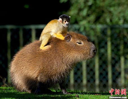 中新网10月19日电 据外媒报道,日前,摄影师在荷兰一个野生动物公园中意外发现,动物园中的一群小猴和水豚竟成了亲密无间的好朋友,这些小猴还三三两两爬到水豚背上“搭便车”,十分有趣。