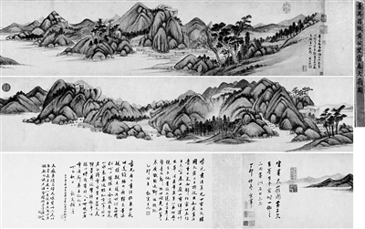 在黄公望《富春山居图》收藏流传中,有两个藏家特别重要,一是明代吴门派领袖沈周,一是明晚期画坛巨擘董其昌。1487年,沈周61岁时凭记忆背临了一卷《仿黄公望富春山居图》,目前该卷藏于北京故宫博物院。而董其昌在1596年得到了黄公望的《富春山居图》。30年后,他又得到沈周的《仿黄公望富春山居图》。次年,73岁的董其昌创作了山水长卷《仿黄公望富春大岭图》。