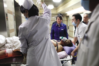 昨晚6时许,朝阳区北京华信医院(原酒仙桥医院)急救室内,事故中的伤者张伟(音)正在接受救治。张伟满脸是血,看起来20多岁,左小腿上有一处碗口大的划伤。“患者需要马上手术。”一名骨科的医生表示。