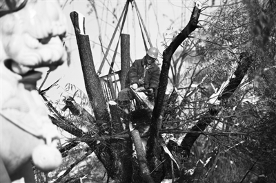 昨日,延庆县城,园林工作人员正在处理因雪灾受损的树木。新京报记者 周岗峰 摄
