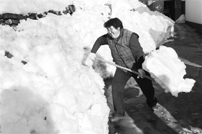 昨日,延庆马道梁村一名妇女在铲雪。新京报记者 尹亚飞 摄
