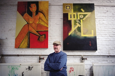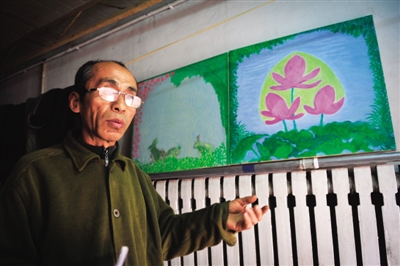 费家村艺术区门口看门的王绍文耳濡目染,也拿起了画笔。
