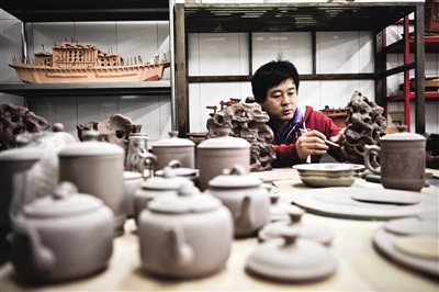 香格里拉紫砂艺术研究所艺术家杜乐正在进行创作。