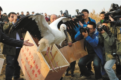 新京报讯 (记者易方兴)昨天,全国鸟类环志中心副主任侯韵秋表示,放飞的15只东方白鹳中,工作人员为3只身体强壮的佩戴了卫星定位器,它们将于8天后传回信号。