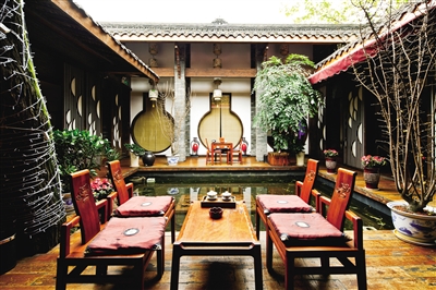 宽云窄雨 在成都,时光变得很慢,在宽窄巷子,时光变得更慢。这座水榭楼阁、曲径通幽的院落里抠出了一条连廊,在下雨天,以雨帘为框,将院子框在了画中,从天井望去,大概就能体验“宽云窄雨”的意境吧。(图4)