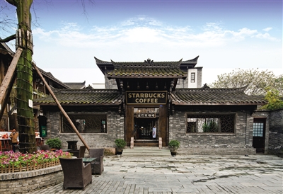 星巴克 到了宽窄巷子,星巴克颇能入乡随俗。一杯咖啡,一个笔记本,透过冰裂纹窗花,望见那伸向天空的翘檐与层层灰瓦的屋顶,恍然间,就穿越回了过去。(图5)