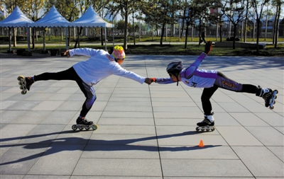 11月20日,两位轮滑队员正在练习新的轮滑技巧。