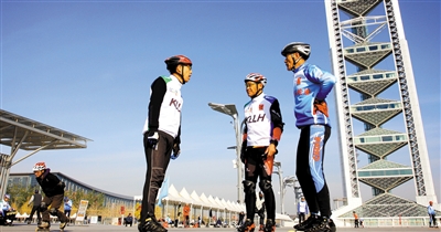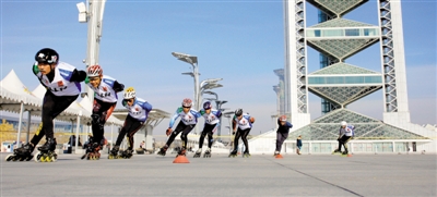 11月20日上午,鸟巢西北侧的运动场地内,轮滑队队员排成一队快速滑行。