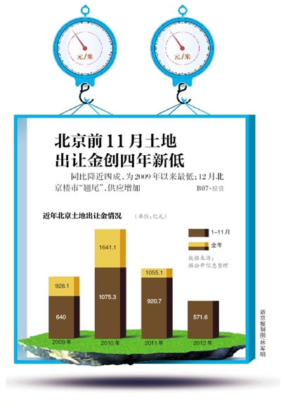 和去年同期920.7亿元相比,今年1-11月北京土地出让金下降约38%。2009年、2010年同期数字分别是640亿元、1075.3亿元。