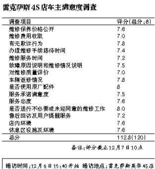 目前,北京有5家雷克萨斯4S店,各店硬件设施过硬。服务方面,调查数据统计显示,整体服务水平较高,总分112.8,各项较为平均。但也有店在售前接待中表现不尽如人意。
