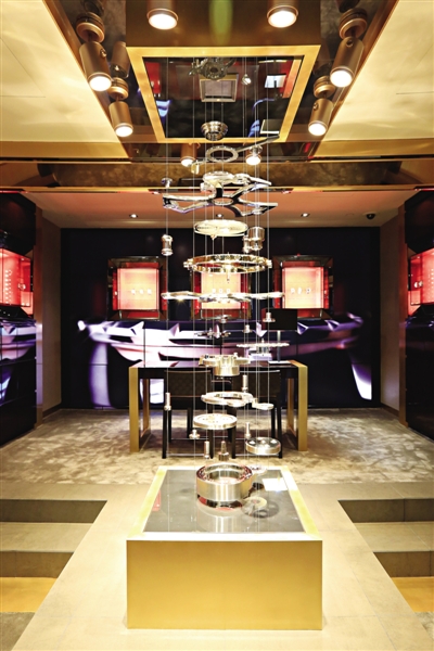 这家店里汇集了罗杰杜彼全部四个系列的腕表,包括盛气凌人的Excalibur(王者)系列、优雅精致的La Monégasque(玩家)系列,设计前卫的Pulsion(冒险家)系列以及奢华的女士Velvet(绝世名伶)系列。此外,品牌的六个珠宝系列也占据了一小块地盘,陀飞轮上的凯尔特十字架意向在这里得到延伸,在不同系列里或像波浪一样弯曲、或为框架所束缚起来,少了一分珠光宝气,却多出不少距离感与神秘气质。在大门口迎接各方宾客的是罗杰杜彼近年的得意之作Pulsion镂空双陀飞轮表,而当开店两周后记者再次访店已不见其踪影,原来早落入买家之手。