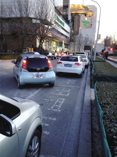 昨日下午,复兴门百盛商场外的马路一侧,出租车位被私家车抢占。新京报记者 卢美慧 摄