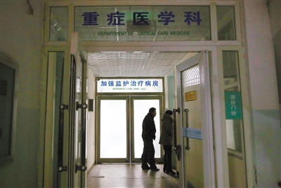 开封第二人民医院,袁厉害的女婿郭海洋在重症监护病房门口踱步,事故中被烧伤的孩子正在接受救治。新京报记者 侯少卿 摄