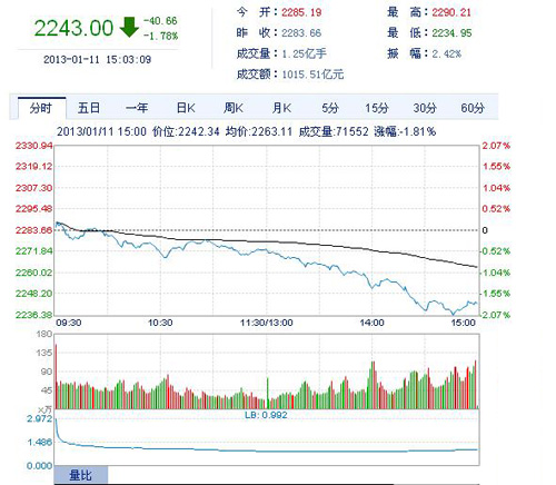 和讯股票消息 今日大盘高开低走,单边下跌,午后金融地产券商联袂杀跌,沪指下跌1.78%,失守五日十日线,报收于2243点,成交1016亿;深成指下跌1.66%,报收于9017.73点,成交1053亿。