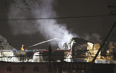 昨日,大钟寺爱家国际收藏品市场内,一小旅馆顶层简易房起火,居住在顶层的3人失踪。新京报记者 浦峰 摄