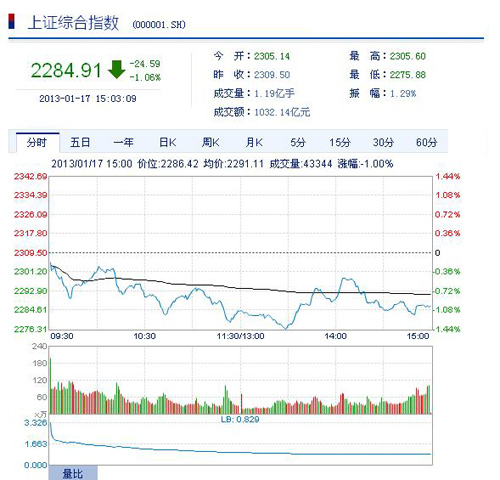和讯股票消息 今日两市低开低走,早盘沪指跌破2300点,跌逾1%,军工股全面暴跌,多只个股跌停,券商、银行、保险等金融股早盘萎靡不振,午后股指平淡维持震荡,天津磁卡(600800,股吧)、士兰微(600460,股吧)等个股受游资追捧,后在券商、银行、地产的护盘下,沪指一度回升至2298点,随后再次下落,截至收盘,沪指报2284.91点,跌1.06%,成交额1032亿元,深成指报9309.23点,跌0.49%,成交额966.3亿元。