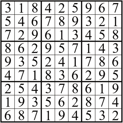 在每个小格子里填上1至9中的数字,使得每行、每列、每个3×3的宫内每个数字各出现一次。