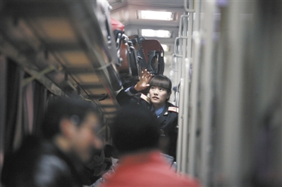 T69次列车准备发车,乘务员帮助学生摆放行李。