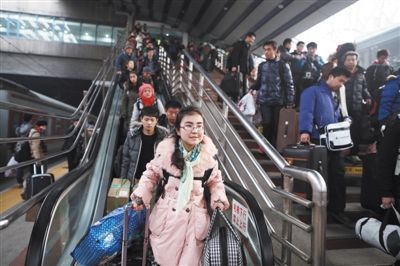 学生们检票进站,提着大包小包“冲”向站台。