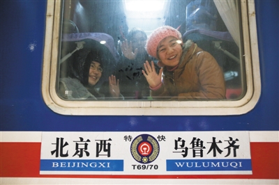 新京报讯 (记者刘春瑞 实习生王伟伟)关门、上锁,T69次列车缓缓启动,从北京西站驶出,它载着1008名学生,一路驶向乌鲁木齐。T69次途经保定、石家庄、太原等18个站,最后到达乌鲁木齐,它也是北京地区开出的首趟学生列车。