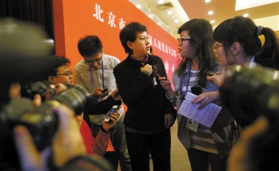 昨日,北京会议中心,市十四届人大一次会议“城市精细化管理”新闻发布会后,市交通委副主任李晓松被记者“包围”。新京报记者 薛珺 摄