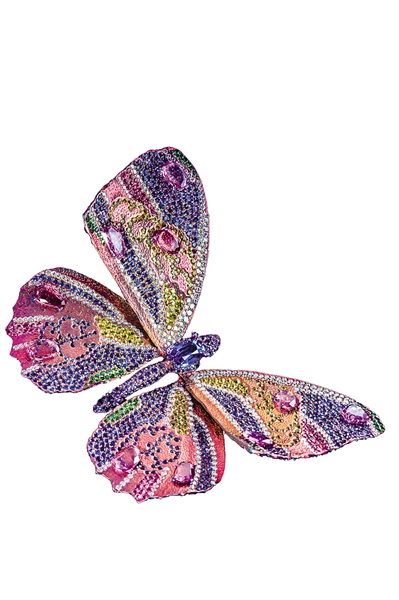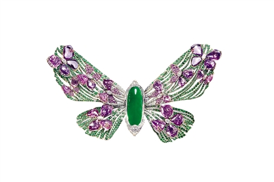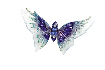 Wallace Chan作品中经常出现蝴蝶。“蝴蝶色彩的变化太丰富了,大家抓不住蝴蝶真正的色彩。”这对于他来说,是个挑战,在如何体现具象的蝴蝶上,他用了天然真的蝴蝶作为翅膀,再找寻不同的宝石还原出蝴蝶翅膀的色彩。或者把某些蝴蝶抽象化,在蝴蝶的身体、翅膀上面镶好宝石,再加上一个变形的宝石,通过这种变形的光让蝴蝶上的斑点显得更灿烂,更灵活地折射在空气里面。