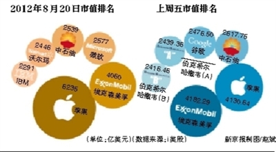 新京报讯 (记者赵嘉妮 林其玲)美国苹果公司股价在美国时间上周五收盘时下跌2.36%,至每股439.88美元,市值跌至4130.64亿美元。与此同时,能源巨头埃克森美孚公司重新坐上全球市值最大上市企业的宝座,周五收盘时股价上涨0.42%至每股91.73美元,市值攀至4182.29亿美元。