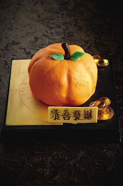 糕饼主厨孔志贤精制外形几可乱真、象征喜庆吉祥的柑橘蛋糕(328港币)。别致的“大吉大利”柑味蛋糕外层为白巧克力,内层则由杏仁味海绵蛋糕及柑橘牛油忌廉组成。