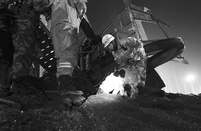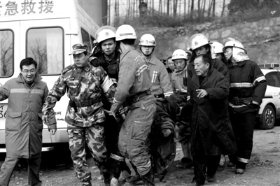 事故现场,消防队员正在将伤者抬出。