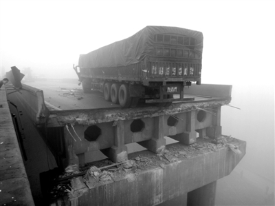 事故现场,一辆幸存的大卡车停在坍塌的桥边。