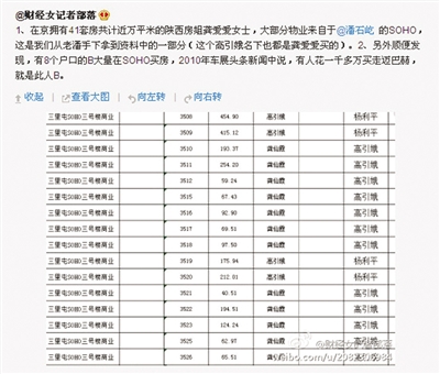 网友“财经女记者部落”微博称,“房姐”多处房产购自潘石屹的SOHO中国。网络截图