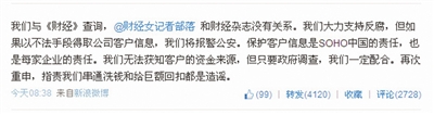 对于“不法手段获取公司客户信息”的说法,“财经女记者部落”在私信中表示,媒体人的天职就是追求真相,而且SOHO的业主信息在很多房地产中介那里都有,并不难获得。