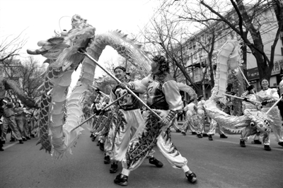 大年初一,龙潭庙会上,来自浙江的非遗项目“平湖九彩祥龙”正在进行表演,赢来了围观游客叫好。实习生 徐洋 摄
