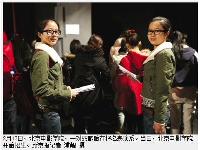 来自北京大兴区的双胞胎姐妹张璐和张琳报名了表演专业。她们说:“快到报名时才跟父母商量了一下。一直也没进行过表演方面的专业培训。来报考纯粹是试一试。”