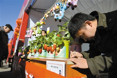 新京报讯 (记者王卡拉)“这盆草莓多少钱,好养活吗,带回家还能结出草莓吗?”在城区庙会陆续结束后,昨日,第二届昌平草莓庙会在昌平区兴寿镇人民政府门前的马路正式开幕。作为这次庙会的主角,草莓摊位虽不太多,但仍吸引了不少游客,尤其是草莓盆栽。