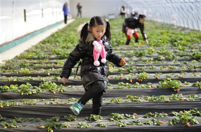 一位小朋友在昌平兴寿镇的草莓园采摘草莓。新京报记者 吴江 摄