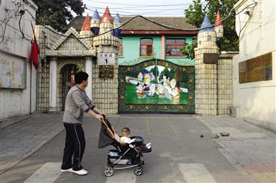 2009年10月14日,一名行人推着孩子从光明路1号的市委机关幼儿园前路过。新京报记者 尹亚飞 摄