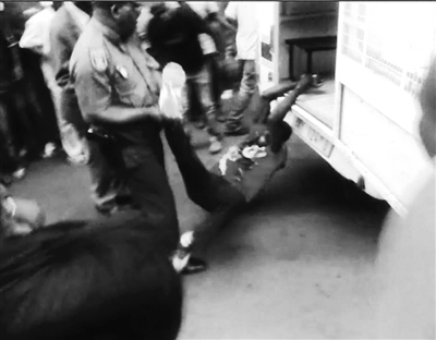 2月26日,南非最大城市约翰内斯堡,一名年轻黑人男子与几名警察理论后,被警察摁倒在地,双手反铐在警车尾部。围观者高喊,“他犯了什么错?我们会拍下来。”但警察毫不理会,并启动警车,绑在警车后面的男子被沿街拖行。警车加速行驶,终于驶离了视线。