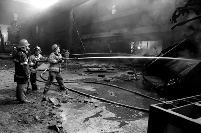 4月1日,消防员在处置爆炸现场。当日11时22分,江西新余钢铁集团公司2号100吨转炉发生爆炸,目前已造成4人死亡,28人受伤。据新余市有关部门透露,目前伤者已送往医院进行救治,进一步情况正在了解核实中。 新华社发